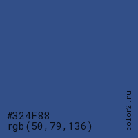 Цвет #324F88 в цветовой модели RGB обозначается тремя октетами (50, 79, 136) в десятичном формате и #324F88 в шестнадцатиричном (hex) формате, которые являются интенсивностью красного 50 (hex 32), интенсивность зелёного 79 (hex 4F) и интенсивность синего 136 (hex 88).