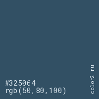 Цвет #325064 в цветовой модели RGB обозначается тремя октетами (50, 80, 100) в десятичном формате и #325064 в шестнадцатиричном (hex) формате, которые являются интенсивностью красного 50 (hex 32), интенсивность зелёного 80 (hex 50) и интенсивность синего 100 (hex 64).