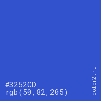 Цвет #3252CD в цветовой модели RGB обозначается тремя октетами (50, 82, 205) в десятичном формате и #3252CD в шестнадцатиричном (hex) формате, которые являются интенсивностью красного 50 (hex 32), интенсивность зелёного 82 (hex 52) и интенсивность синего 205 (hex CD).