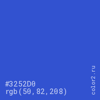 Цвет #3252D0 в цветовой модели RGB обозначается тремя октетами (50, 82, 208) в десятичном формате и #3252D0 в шестнадцатиричном (hex) формате, которые являются интенсивностью красного 50 (hex 32), интенсивность зелёного 82 (hex 52) и интенсивность синего 208 (hex D0).