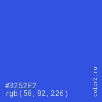 Цвет #3252E2 в цветовой модели RGB обозначается тремя октетами (50, 82, 226) в десятичном формате и #3252E2 в шестнадцатиричном (hex) формате, которые являются интенсивностью красного 50 (hex 32), интенсивность зелёного 82 (hex 52) и интенсивность синего 226 (hex E2).