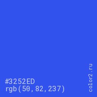 Цвет #3252ED в цветовой модели RGB обозначается тремя октетами (50, 82, 237) в десятичном формате и #3252ED в шестнадцатиричном (hex) формате, которые являются интенсивностью красного 50 (hex 32), интенсивность зелёного 82 (hex 52) и интенсивность синего 237 (hex ED).