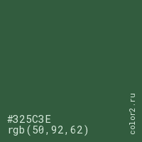 Цвет #325C3E в цветовой модели RGB обозначается тремя октетами (50, 92, 62) в десятичном формате и #325C3E в шестнадцатиричном (hex) формате, которые являются интенсивностью красного 50 (hex 32), интенсивность зелёного 92 (hex 5C) и интенсивность синего 62 (hex 3E).