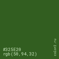 Цвет #325E20 в цветовой модели RGB обозначается тремя октетами (50, 94, 32) в десятичном формате и #325E20 в шестнадцатиричном (hex) формате, которые являются интенсивностью красного 50 (hex 32), интенсивность зелёного 94 (hex 5E) и интенсивность синего 32 (hex 20).