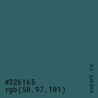 Цвет #326165 в цветовой модели RGB обозначается тремя октетами (50, 97, 101) в десятичном формате и #326165 в шестнадцатиричном (hex) формате, которые являются интенсивностью красного 50 (hex 32), интенсивность зелёного 97 (hex 61) и интенсивность синего 101 (hex 65).