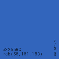 Цвет #3265BC в цветовой модели RGB обозначается тремя октетами (50, 101, 188) в десятичном формате и #3265BC в шестнадцатиричном (hex) формате, которые являются интенсивностью красного 50 (hex 32), интенсивность зелёного 101 (hex 65) и интенсивность синего 188 (hex BC).