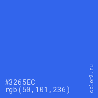 Цвет #3265EC в цветовой модели RGB обозначается тремя октетами (50, 101, 236) в десятичном формате и #3265EC в шестнадцатиричном (hex) формате, которые являются интенсивностью красного 50 (hex 32), интенсивность зелёного 101 (hex 65) и интенсивность синего 236 (hex EC).