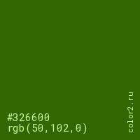 Цвет #326600 в цветовой модели RGB обозначается тремя октетами (50, 102, 0) в десятичном формате и #326600 в шестнадцатиричном (hex) формате, которые являются интенсивностью красного 50 (hex 32), интенсивность зелёного 102 (hex 66) и интенсивность синего 0 (hex 00).