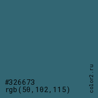 Цвет #326673 в цветовой модели RGB обозначается тремя октетами (50, 102, 115) в десятичном формате и #326673 в шестнадцатиричном (hex) формате, которые являются интенсивностью красного 50 (hex 32), интенсивность зелёного 102 (hex 66) и интенсивность синего 115 (hex 73).