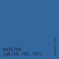 Цвет #32679D в цветовой модели RGB обозначается тремя октетами (50, 103, 157) в десятичном формате и #32679D в шестнадцатиричном (hex) формате, которые являются интенсивностью красного 50 (hex 32), интенсивность зелёного 103 (hex 67) и интенсивность синего 157 (hex 9D).