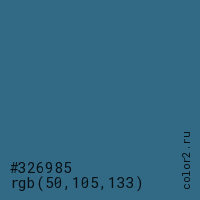 Цвет #326985 в цветовой модели RGB обозначается тремя октетами (50, 105, 133) в десятичном формате и #326985 в шестнадцатиричном (hex) формате, которые являются интенсивностью красного 50 (hex 32), интенсивность зелёного 105 (hex 69) и интенсивность синего 133 (hex 85).