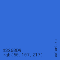 Цвет #326BD9 в цветовой модели RGB обозначается тремя октетами (50, 107, 217) в десятичном формате и #326BD9 в шестнадцатиричном (hex) формате, которые являются интенсивностью красного 50 (hex 32), интенсивность зелёного 107 (hex 6B) и интенсивность синего 217 (hex D9).