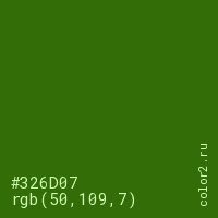 Цвет #326D07 в цветовой модели RGB обозначается тремя октетами (50, 109, 7) в десятичном формате и #326D07 в шестнадцатиричном (hex) формате, которые являются интенсивностью красного 50 (hex 32), интенсивность зелёного 109 (hex 6D) и интенсивность синего 7 (hex 07).
