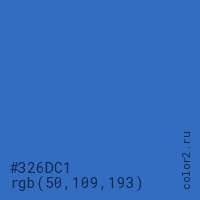 Цвет #326DC1 в цветовой модели RGB обозначается тремя октетами (50, 109, 193) в десятичном формате и #326DC1 в шестнадцатиричном (hex) формате, которые являются интенсивностью красного 50 (hex 32), интенсивность зелёного 109 (hex 6D) и интенсивность синего 193 (hex C1).