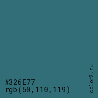 Цвет #326E77 в цветовой модели RGB обозначается тремя октетами (50, 110, 119) в десятичном формате и #326E77 в шестнадцатиричном (hex) формате, которые являются интенсивностью красного 50 (hex 32), интенсивность зелёного 110 (hex 6E) и интенсивность синего 119 (hex 77).