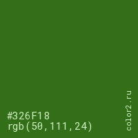 Цвет #326F18 в цветовой модели RGB обозначается тремя октетами (50, 111, 24) в десятичном формате и #326F18 в шестнадцатиричном (hex) формате, которые являются интенсивностью красного 50 (hex 32), интенсивность зелёного 111 (hex 6F) и интенсивность синего 24 (hex 18).