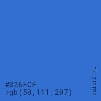 Цвет #326FCF в цветовой модели RGB обозначается тремя октетами (50, 111, 207) в десятичном формате и #326FCF в шестнадцатиричном (hex) формате, которые являются интенсивностью красного 50 (hex 32), интенсивность зелёного 111 (hex 6F) и интенсивность синего 207 (hex CF).
