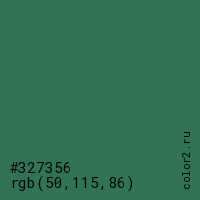 Цвет #327356 в цветовой модели RGB обозначается тремя октетами (50, 115, 86) в десятичном формате и #327356 в шестнадцатиричном (hex) формате, которые являются интенсивностью красного 50 (hex 32), интенсивность зелёного 115 (hex 73) и интенсивность синего 86 (hex 56).