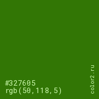 Цвет #327605 в цветовой модели RGB обозначается тремя октетами (50, 118, 5) в десятичном формате и #327605 в шестнадцатиричном (hex) формате, которые являются интенсивностью красного 50 (hex 32), интенсивность зелёного 118 (hex 76) и интенсивность синего 5 (hex 05).