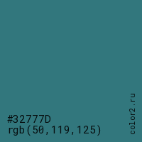 Цвет #32777D в цветовой модели RGB обозначается тремя октетами (50, 119, 125) в десятичном формате и #32777D в шестнадцатиричном (hex) формате, которые являются интенсивностью красного 50 (hex 32), интенсивность зелёного 119 (hex 77) и интенсивность синего 125 (hex 7D).