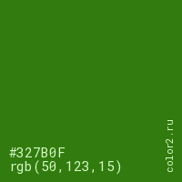 Цвет #327B0F в цветовой модели RGB обозначается тремя октетами (50, 123, 15) в десятичном формате и #327B0F в шестнадцатиричном (hex) формате, которые являются интенсивностью красного 50 (hex 32), интенсивность зелёного 123 (hex 7B) и интенсивность синего 15 (hex 0F).