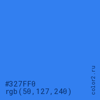 Цвет #327FF0 в цветовой модели RGB обозначается тремя октетами (50, 127, 240) в десятичном формате и #327FF0 в шестнадцатиричном (hex) формате, которые являются интенсивностью красного 50 (hex 32), интенсивность зелёного 127 (hex 7F) и интенсивность синего 240 (hex F0).