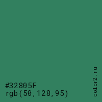 Цвет #32805F в цветовой модели RGB обозначается тремя октетами (50, 128, 95) в десятичном формате и #32805F в шестнадцатиричном (hex) формате, которые являются интенсивностью красного 50 (hex 32), интенсивность зелёного 128 (hex 80) и интенсивность синего 95 (hex 5F).