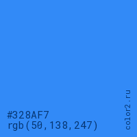 Цвет #328AF7 в цветовой модели RGB обозначается тремя октетами (50, 138, 247) в десятичном формате и #328AF7 в шестнадцатиричном (hex) формате, которые являются интенсивностью красного 50 (hex 32), интенсивность зелёного 138 (hex 8A) и интенсивность синего 247 (hex F7).
