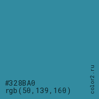 Цвет #328BA0 в цветовой модели RGB обозначается тремя октетами (50, 139, 160) в десятичном формате и #328BA0 в шестнадцатиричном (hex) формате, которые являются интенсивностью красного 50 (hex 32), интенсивность зелёного 139 (hex 8B) и интенсивность синего 160 (hex A0).