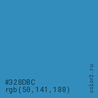 Цвет #328DBC в цветовой модели RGB обозначается тремя октетами (50, 141, 188) в десятичном формате и #328DBC в шестнадцатиричном (hex) формате, которые являются интенсивностью красного 50 (hex 32), интенсивность зелёного 141 (hex 8D) и интенсивность синего 188 (hex BC).