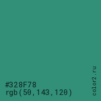Цвет #328F78 в цветовой модели RGB обозначается тремя октетами (50, 143, 120) в десятичном формате и #328F78 в шестнадцатиричном (hex) формате, которые являются интенсивностью красного 50 (hex 32), интенсивность зелёного 143 (hex 8F) и интенсивность синего 120 (hex 78).