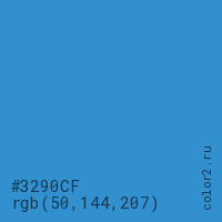 Цвет #3290CF в цветовой модели RGB обозначается тремя октетами (50, 144, 207) в десятичном формате и #3290CF в шестнадцатиричном (hex) формате, которые являются интенсивностью красного 50 (hex 32), интенсивность зелёного 144 (hex 90) и интенсивность синего 207 (hex CF).