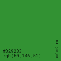 Цвет #329233 в цветовой модели RGB обозначается тремя октетами (50, 146, 51) в десятичном формате и #329233 в шестнадцатиричном (hex) формате, которые являются интенсивностью красного 50 (hex 32), интенсивность зелёного 146 (hex 92) и интенсивность синего 51 (hex 33).