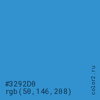 Цвет #3292D0 в цветовой модели RGB обозначается тремя октетами (50, 146, 208) в десятичном формате и #3292D0 в шестнадцатиричном (hex) формате, которые являются интенсивностью красного 50 (hex 32), интенсивность зелёного 146 (hex 92) и интенсивность синего 208 (hex D0).