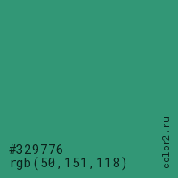 Цвет #329776 в цветовой модели RGB обозначается тремя октетами (50, 151, 118) в десятичном формате и #329776 в шестнадцатиричном (hex) формате, которые являются интенсивностью красного 50 (hex 32), интенсивность зелёного 151 (hex 97) и интенсивность синего 118 (hex 76).