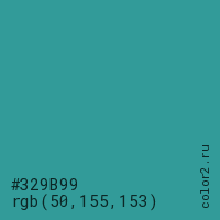 Цвет #329B99 в цветовой модели RGB обозначается тремя октетами (50, 155, 153) в десятичном формате и #329B99 в шестнадцатиричном (hex) формате, которые являются интенсивностью красного 50 (hex 32), интенсивность зелёного 155 (hex 9B) и интенсивность синего 153 (hex 99).