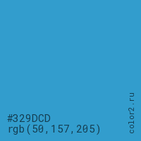 Цвет #329DCD в цветовой модели RGB обозначается тремя октетами (50, 157, 205) в десятичном формате и #329DCD в шестнадцатиричном (hex) формате, которые являются интенсивностью красного 50 (hex 32), интенсивность зелёного 157 (hex 9D) и интенсивность синего 205 (hex CD).