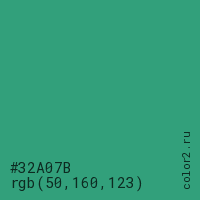 Цвет #32A07B в цветовой модели RGB обозначается тремя октетами (50, 160, 123) в десятичном формате и #32A07B в шестнадцатиричном (hex) формате, которые являются интенсивностью красного 50 (hex 32), интенсивность зелёного 160 (hex A0) и интенсивность синего 123 (hex 7B).