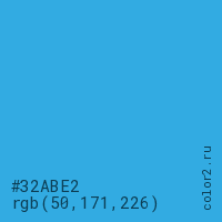 Цвет #32ABE2 в цветовой модели RGB обозначается тремя октетами (50, 171, 226) в десятичном формате и #32ABE2 в шестнадцатиричном (hex) формате, которые являются интенсивностью красного 50 (hex 32), интенсивность зелёного 171 (hex AB) и интенсивность синего 226 (hex E2).