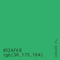 Цвет #32AF68 в цветовой модели RGB обозначается тремя октетами (50, 175, 104) в десятичном формате и #32AF68 в шестнадцатиричном (hex) формате, которые являются интенсивностью красного 50 (hex 32), интенсивность зелёного 175 (hex AF) и интенсивность синего 104 (hex 68).