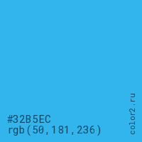Цвет #32B5EC в цветовой модели RGB обозначается тремя октетами (50, 181, 236) в десятичном формате и #32B5EC в шестнадцатиричном (hex) формате, которые являются интенсивностью красного 50 (hex 32), интенсивность зелёного 181 (hex B5) и интенсивность синего 236 (hex EC).