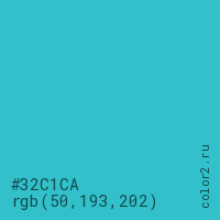 Цвет #32C1CA в цветовой модели RGB обозначается тремя октетами (50, 193, 202) в десятичном формате и #32C1CA в шестнадцатиричном (hex) формате, которые являются интенсивностью красного 50 (hex 32), интенсивность зелёного 193 (hex C1) и интенсивность синего 202 (hex CA).