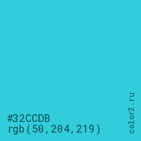 Цвет #32CCDB в цветовой модели RGB обозначается тремя октетами (50, 204, 219) в десятичном формате и #32CCDB в шестнадцатиричном (hex) формате, которые являются интенсивностью красного 50 (hex 32), интенсивность зелёного 204 (hex CC) и интенсивность синего 219 (hex DB).