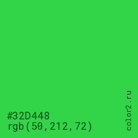 Цвет #32D448 в цветовой модели RGB обозначается тремя октетами (50, 212, 72) в десятичном формате и #32D448 в шестнадцатиричном (hex) формате, которые являются интенсивностью красного 50 (hex 32), интенсивность зелёного 212 (hex D4) и интенсивность синего 72 (hex 48).