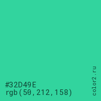 Цвет #32D49E в цветовой модели RGB обозначается тремя октетами (50, 212, 158) в десятичном формате и #32D49E в шестнадцатиричном (hex) формате, которые являются интенсивностью красного 50 (hex 32), интенсивность зелёного 212 (hex D4) и интенсивность синего 158 (hex 9E).