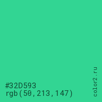 Цвет #32D593 в цветовой модели RGB обозначается тремя октетами (50, 213, 147) в десятичном формате и #32D593 в шестнадцатиричном (hex) формате, которые являются интенсивностью красного 50 (hex 32), интенсивность зелёного 213 (hex D5) и интенсивность синего 147 (hex 93).