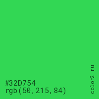 Цвет #32D754 в цветовой модели RGB обозначается тремя октетами (50, 215, 84) в десятичном формате и #32D754 в шестнадцатиричном (hex) формате, которые являются интенсивностью красного 50 (hex 32), интенсивность зелёного 215 (hex D7) и интенсивность синего 84 (hex 54).