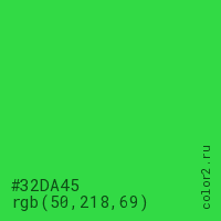Цвет #32DA45 в цветовой модели RGB обозначается тремя октетами (50, 218, 69) в десятичном формате и #32DA45 в шестнадцатиричном (hex) формате, которые являются интенсивностью красного 50 (hex 32), интенсивность зелёного 218 (hex DA) и интенсивность синего 69 (hex 45).
