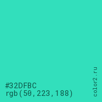 Цвет #32DFBC в цветовой модели RGB обозначается тремя октетами (50, 223, 188) в десятичном формате и #32DFBC в шестнадцатиричном (hex) формате, которые являются интенсивностью красного 50 (hex 32), интенсивность зелёного 223 (hex DF) и интенсивность синего 188 (hex BC).