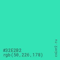 Цвет #32E2B2 в цветовой модели RGB обозначается тремя октетами (50, 226, 178) в десятичном формате и #32E2B2 в шестнадцатиричном (hex) формате, которые являются интенсивностью красного 50 (hex 32), интенсивность зелёного 226 (hex E2) и интенсивность синего 178 (hex B2).